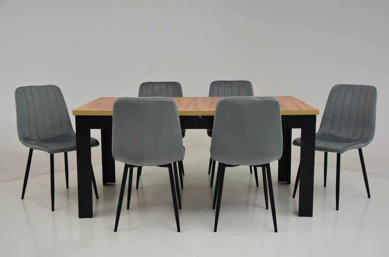 Stół – serce jadalni. Powinien być na tyle duży, by pomieścić domowników (minimum 60 cm szerokości blatu na osobę), ale jednocześnie nie zagracić przestrzeni. Najbardziej uniwersalne są stoły rozkładane – na co dzień mogą być mniejsze, a przy większych spotkaniach dają się powiększyć. Na przykład prostokątny stół z kolekcji C-8 ma wymiary 80×140 cm na co dzień, a po rozłożeniu aż 180 cm długości – idealny, gdy przyjmujemy gości. W duecie z nim dobrze wyglądają nowoczesne krzesła tapicerowane welurem. Taki komplet znajdziemy w ofercie ekonomicznej: zestaw 4 krzeseł IK-13 ze stołem C-8 w dekorze dąb Artisan to popularny wybór do niewielkiej jadalni. Jego styl można określić jako nowoczesny z nutą loft – prosty drewniany blat i czarne metalowe nogi stołu, a krzesła wygodne, w obiciu z miękkiego materiału. Opcja budżetowa nie oznacza rezygnacji z designu – ten zestaw wygląda atrakcyjnie, a kosztuje niewiele ponad 1000 zł.