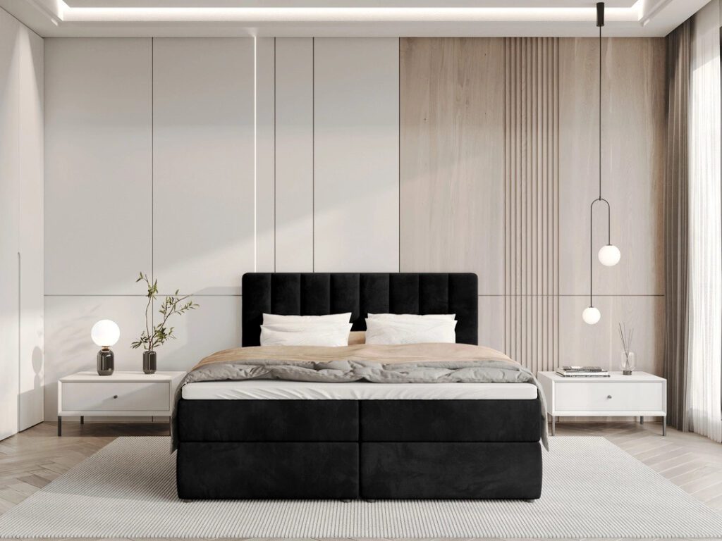 Czarne łóżko kontynentalne z pojemnikiem 140×200 cm DENVER welur